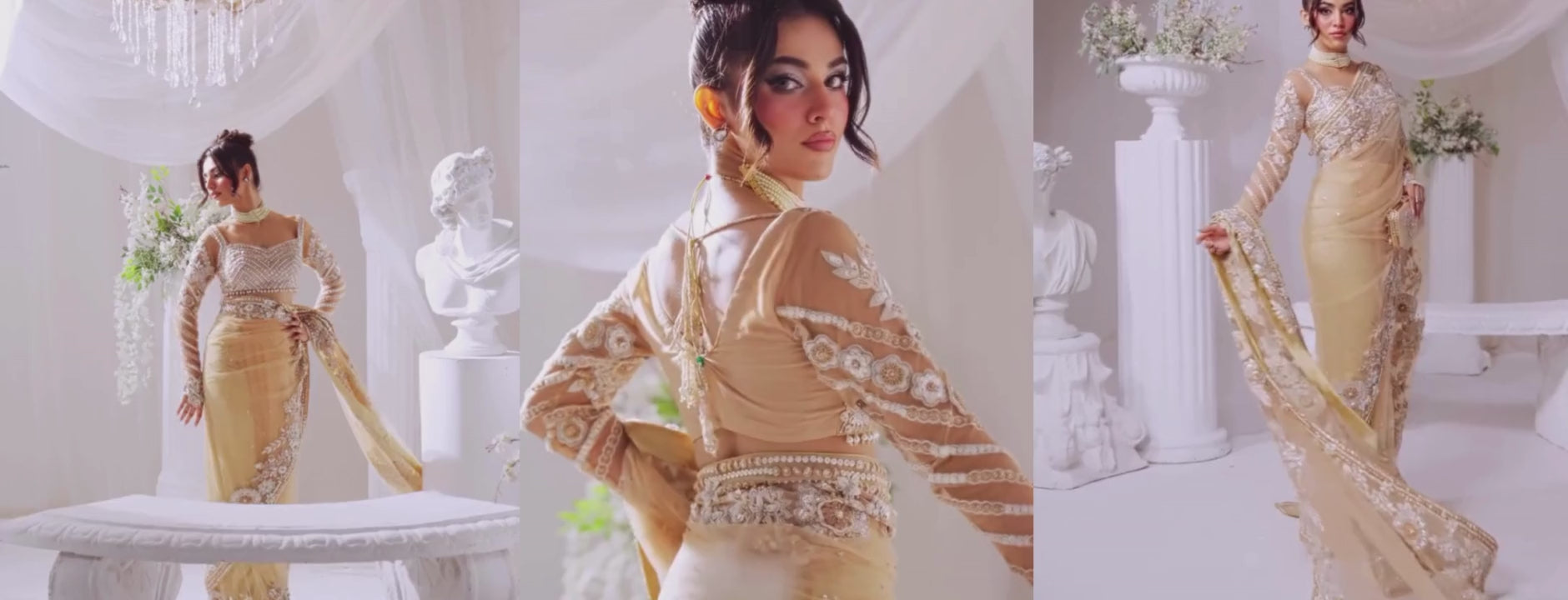 Maharani is a vision of regal elegance, crafted in sheer net and adorned with exquisite hand embellishments including pearls, sitara, kora, dabka, nakshi, gota, crystal beads, and diamond-like stones that shimmer beautifully with every movement. Intricately handmade net flowers with crystal accents create a stunning 3D sparkle, while the pallu’s graceful bird motifs and the finely detailed net blouse with embellished sleeves bring timeless sophistication to the ensemble. Customisation is available on request, with delivery within 4–8 weeks.