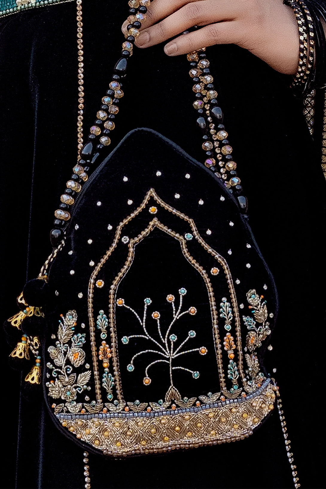 Complemented by a delicate chiffon sitara dupatta featuring a hand-embroidered neckpiece for added sophistication