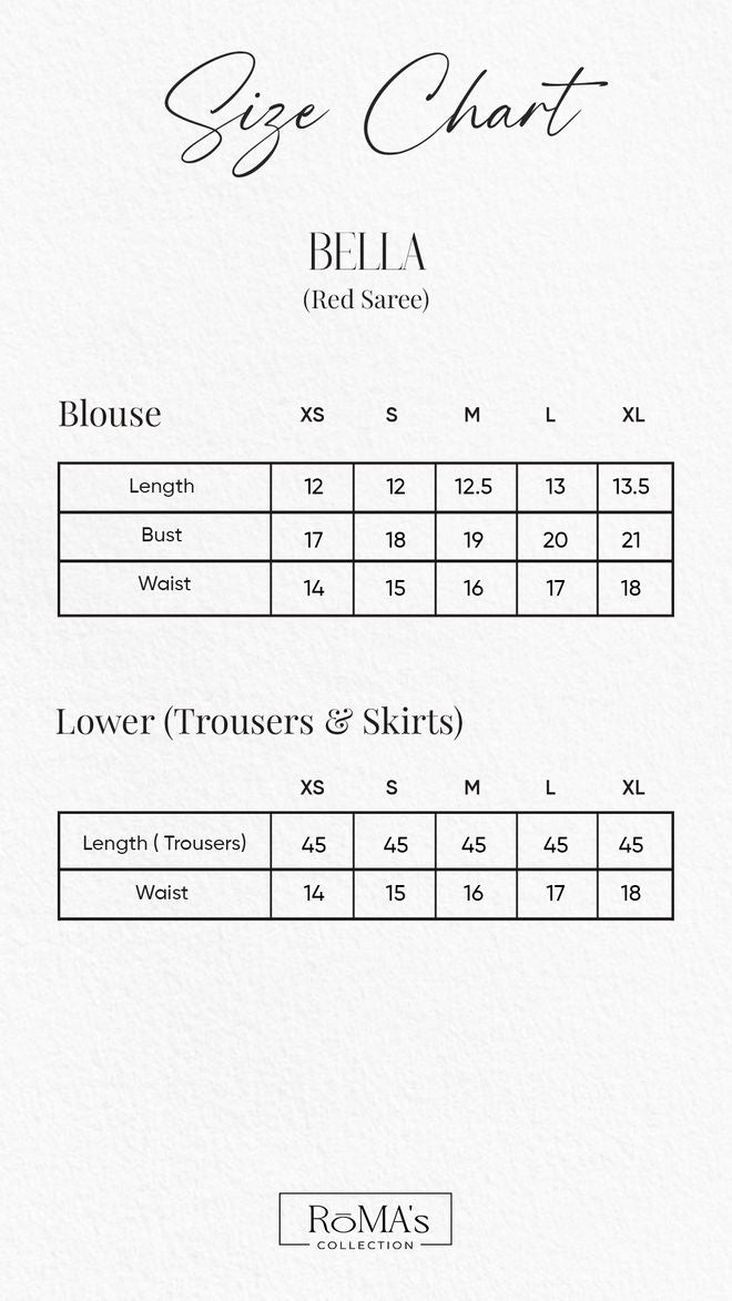 Bella – a stunning red-on-red handcrafted chiffon sari designed to make every entrance unforgettable. The sari features intricate kora, dabka, katdana, sequin sitara, and pearl detailing, paired with a versatile blouse that can be styled off-the-shoulder or worn traditionally. A handcrafted belt and matching clutch complete the elegant, glamorous look — perfect for weddings and festive occasions.