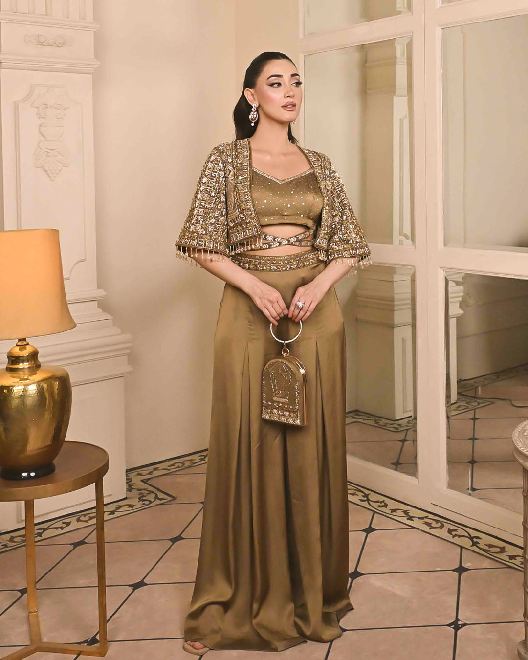 Designed to complete the statement Bonita ensemble, this handcrafted clutch bag features intricate kora, nakshi, and pearl detailing, echoing the jacket’s stunning embellishments and bird motifs.