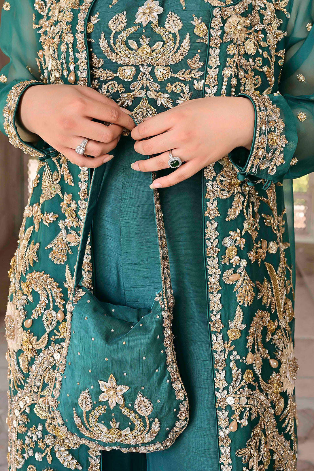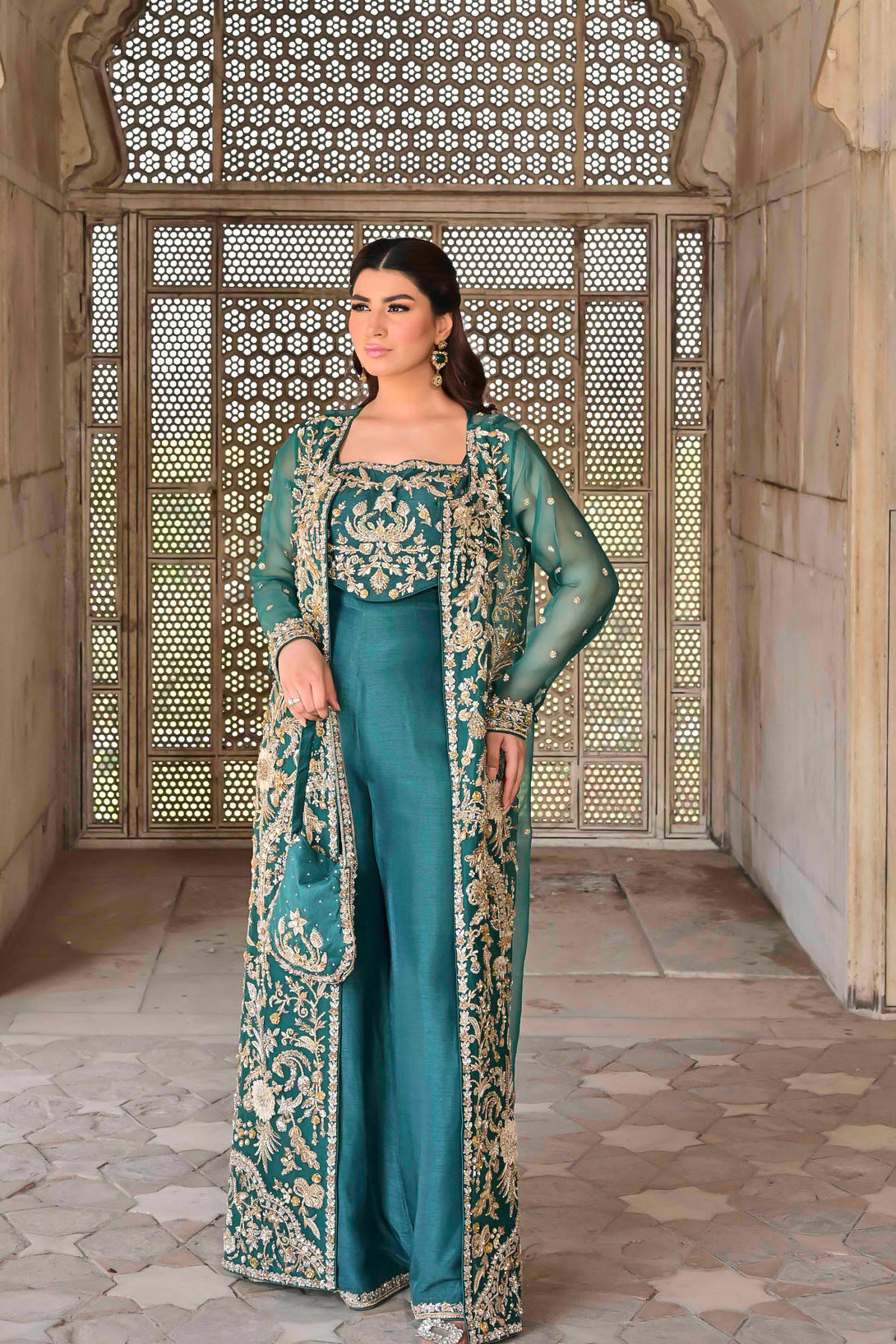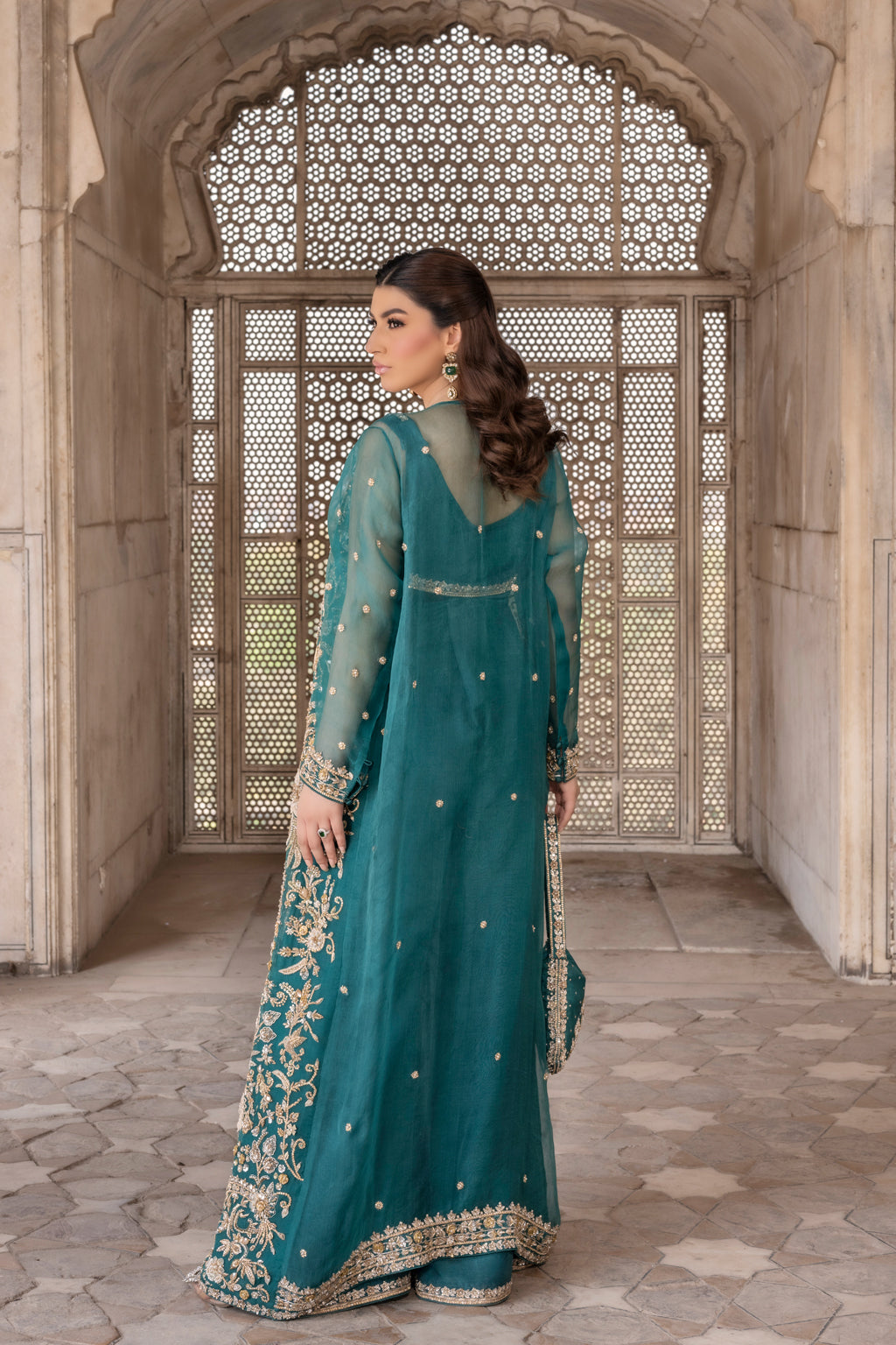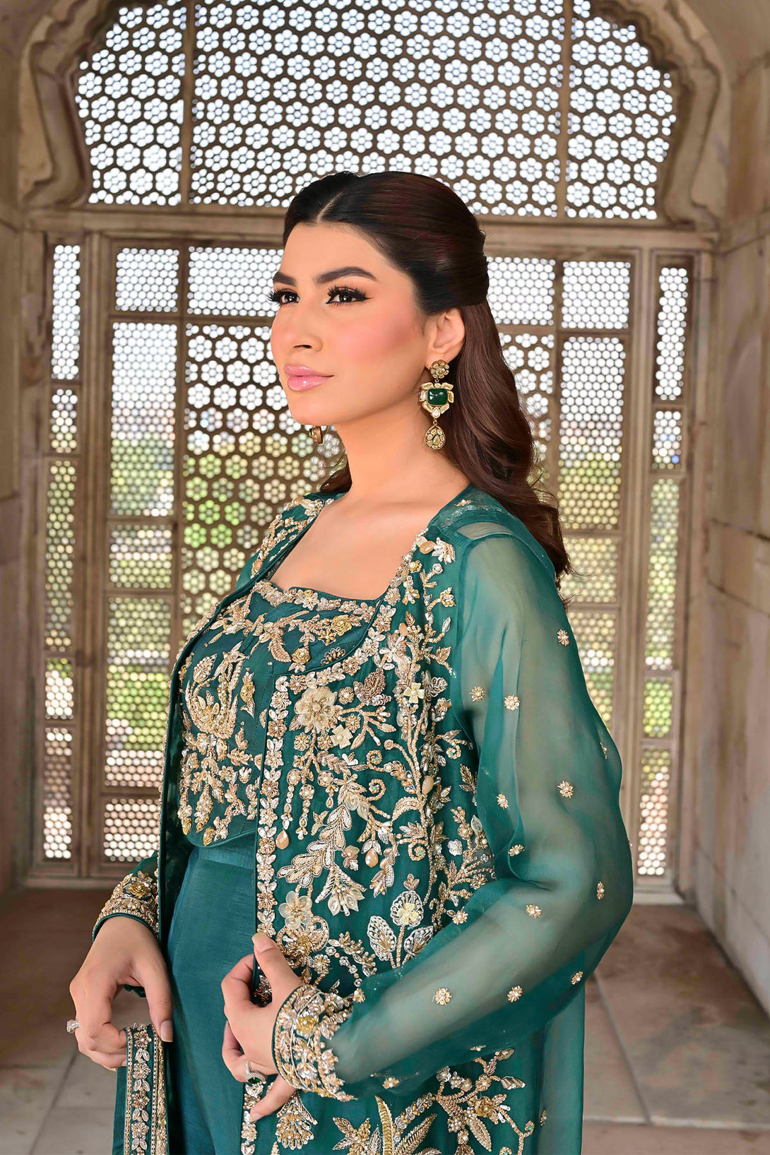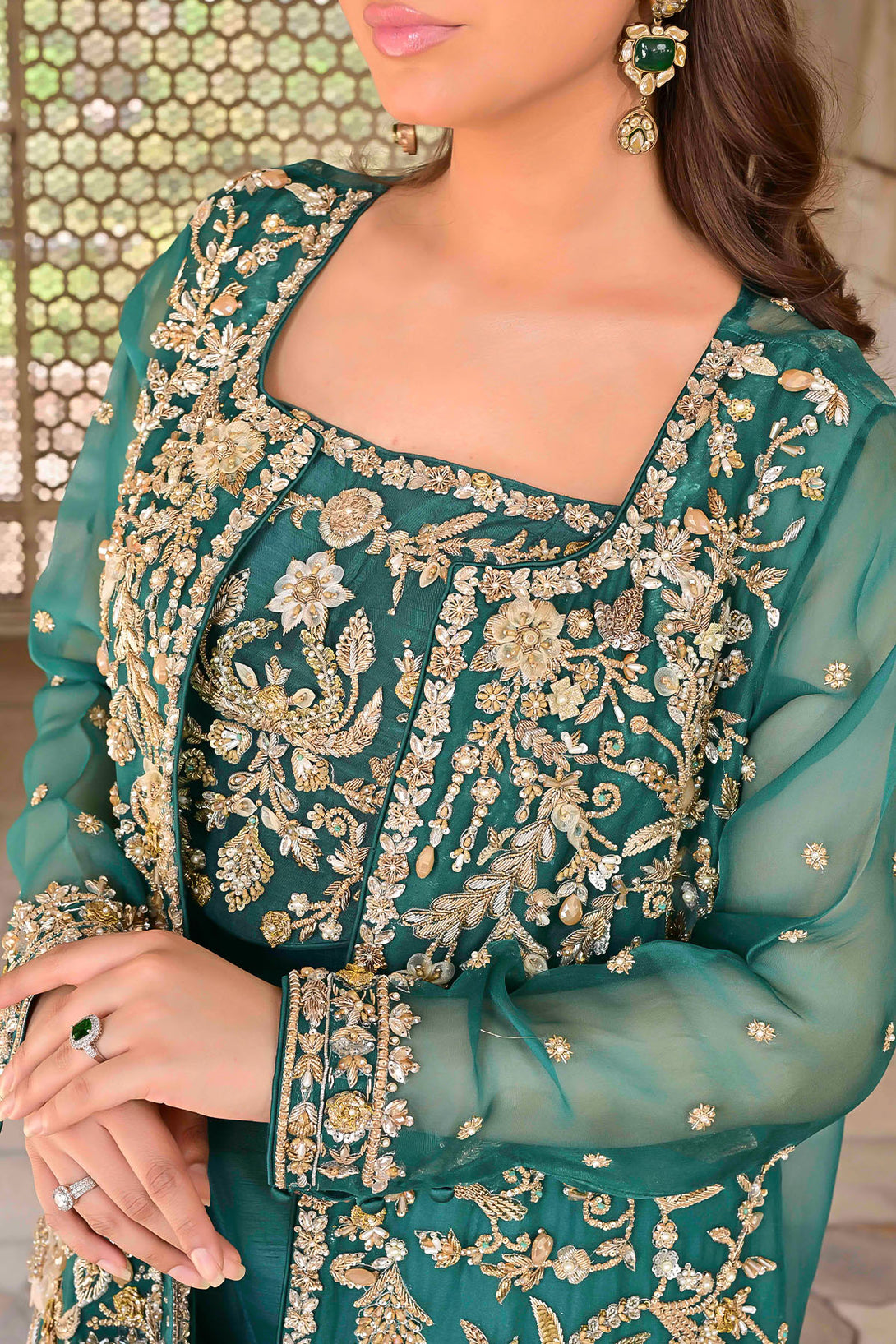 Features a long organza jacket adorned with handcrafted detailing including crystals, dabka, kora, pearls, organza & net flowers, stones, and nakshi