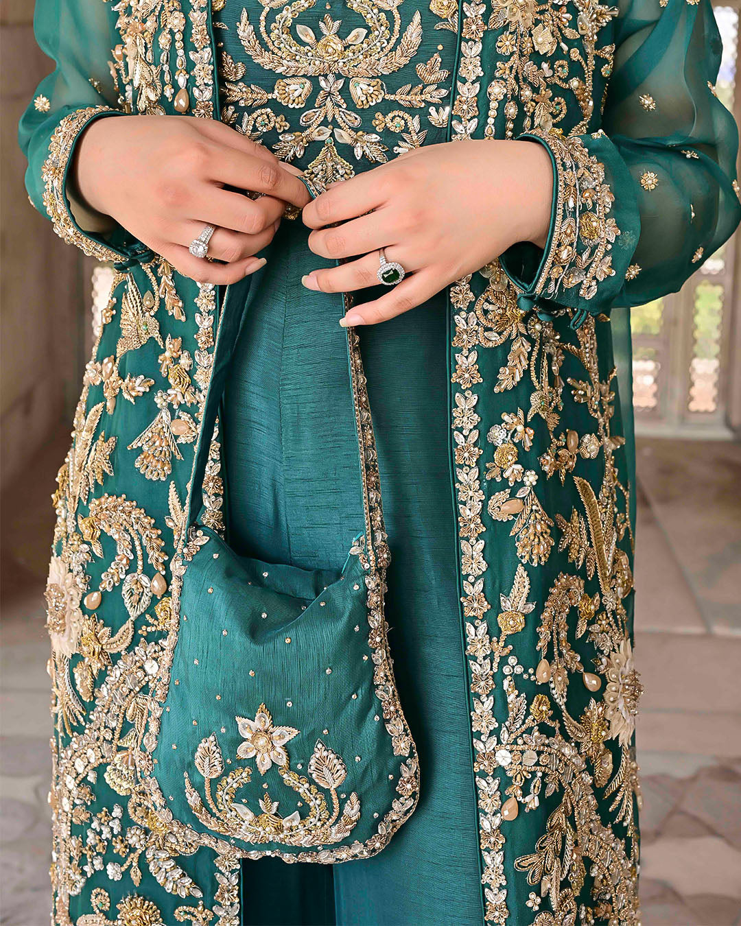 Adorned with delicate crystals, kora, pearls, and floral accents, it beautifully complements the detailed craftsmanship of the outfit while offering a graceful, coordinated finish.