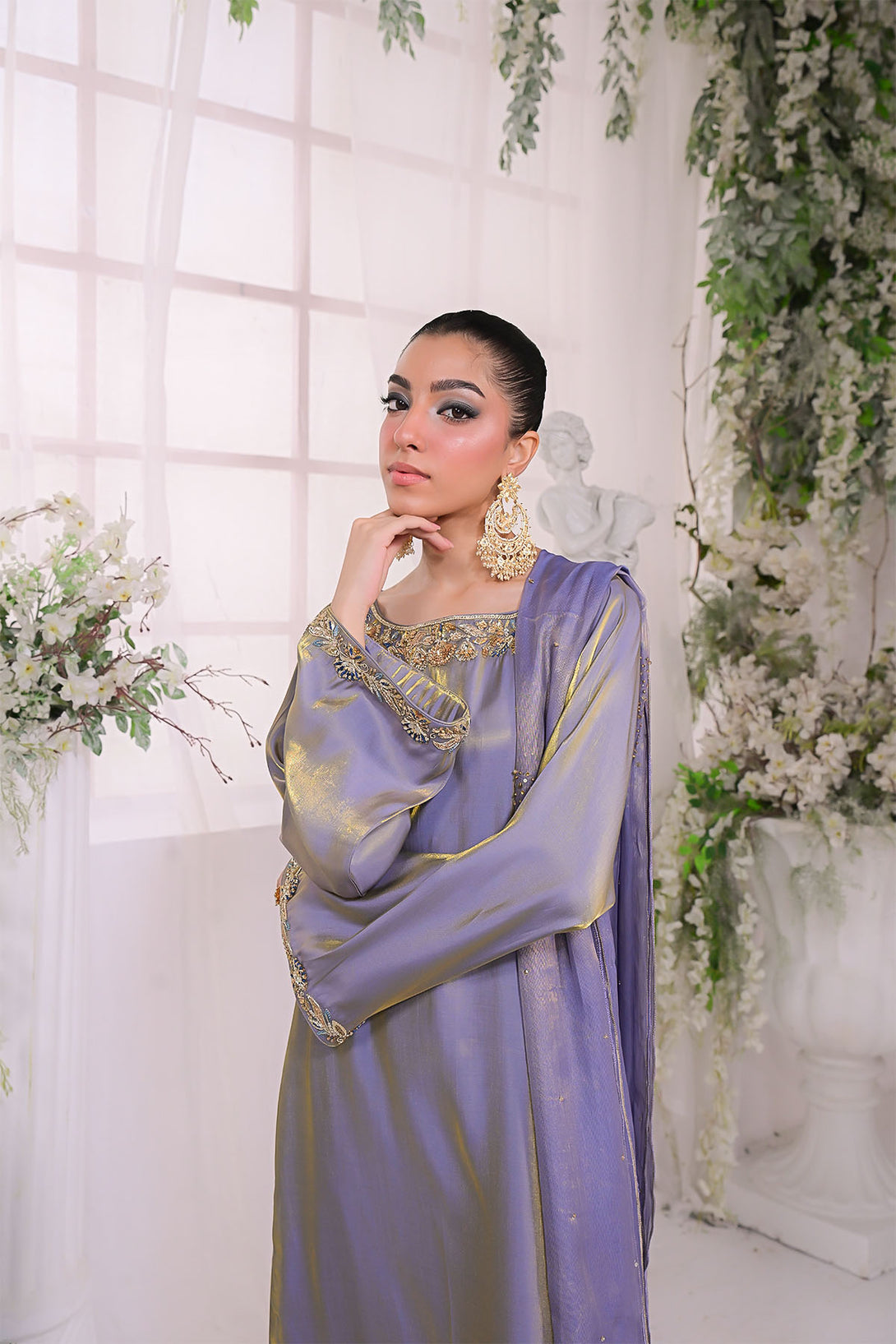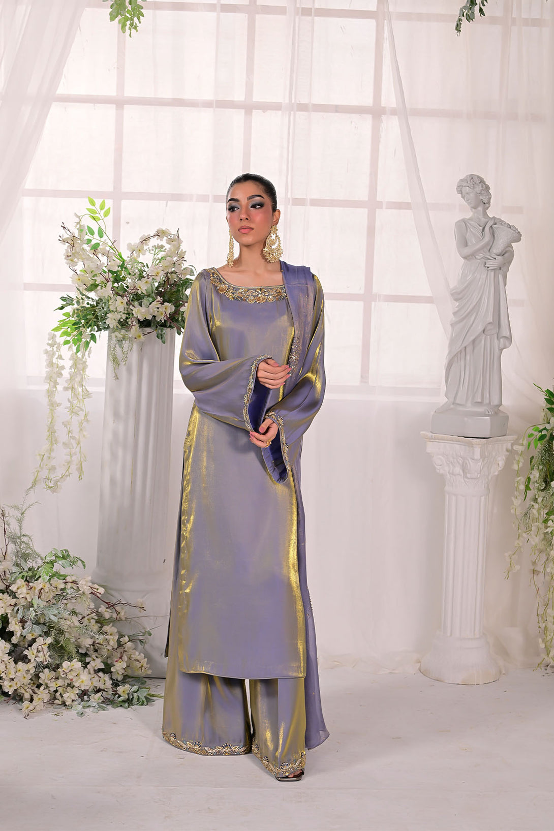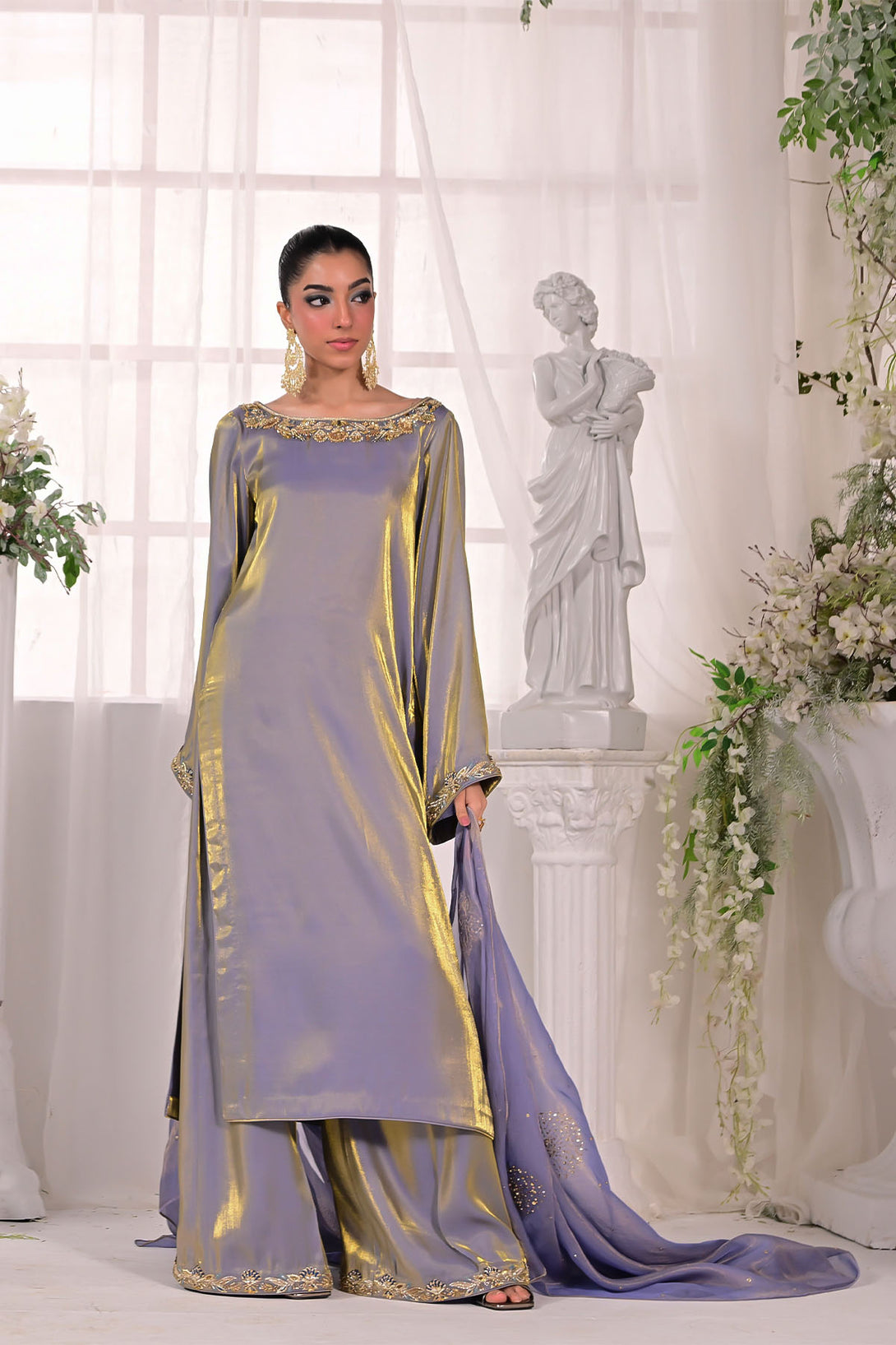 A two-toned chiffon silk long shirt paired with flared trousers, featuring a handcrafted neckline along with detailed borders on the sleeves and trousers. Styled with a masoori dupatta embellished with delicate sitara work for a refined festive finish.