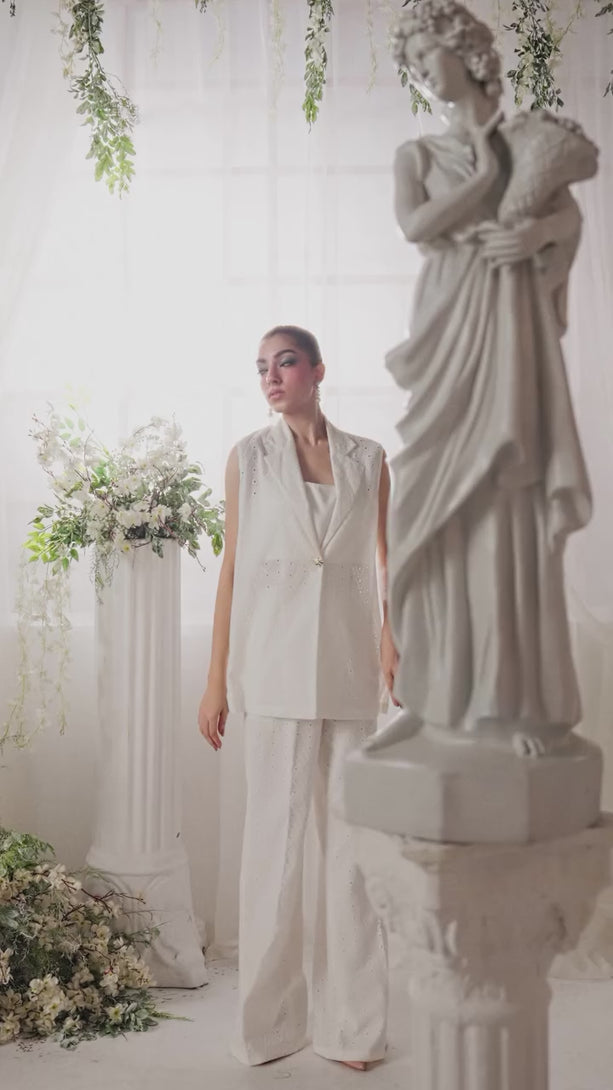 Tokyo – a chic cotton fusion co-ord set designed for effortless style. Featuring a sleeveless blazer top, plain crop layer, and bell-shaped trousers with pockets, this set blends comfort with contemporary sophistication.