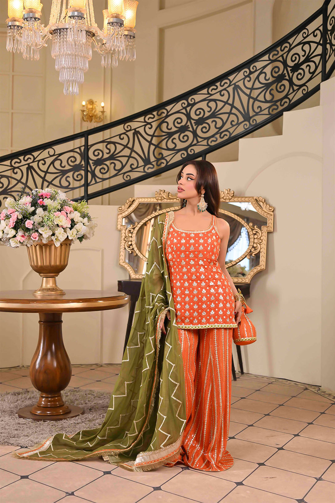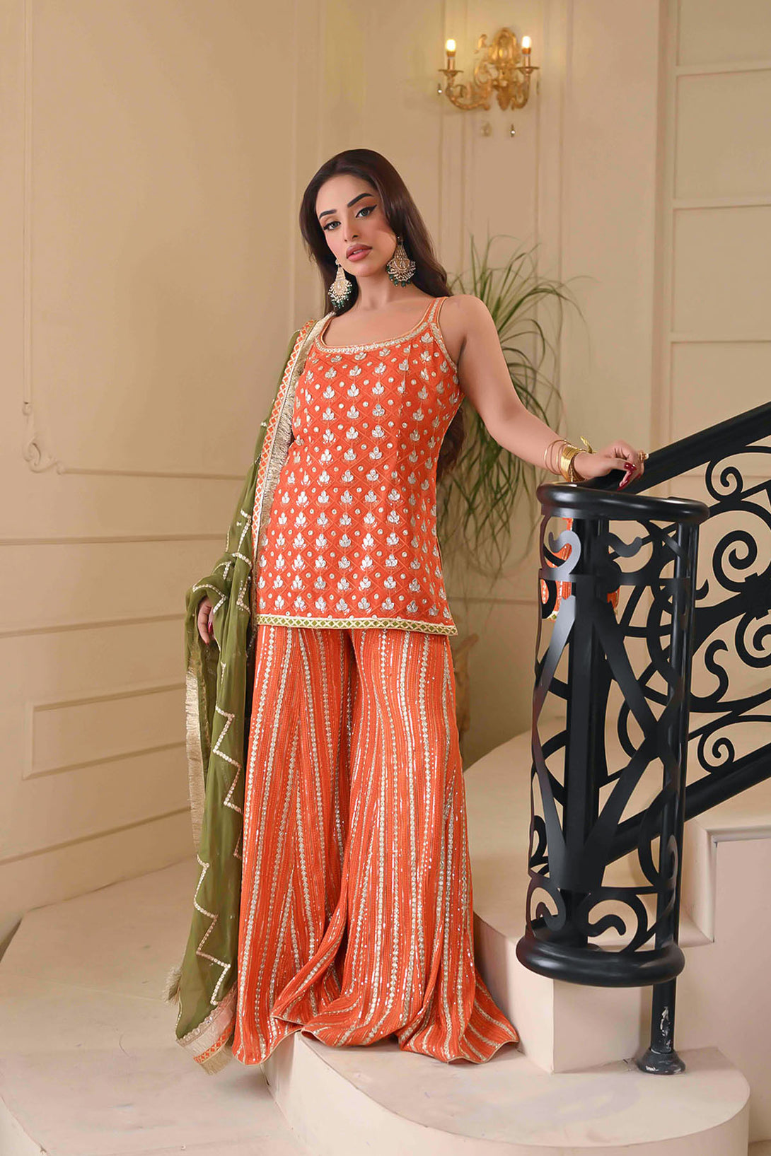 Finished with a mehandi green dupatta embellished with elegant foil work