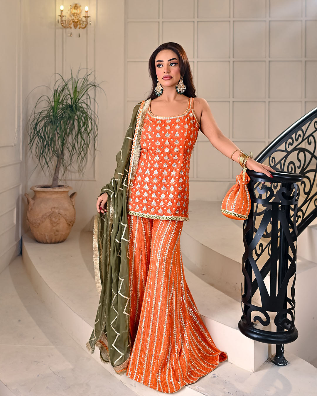 A lively complement to the vibrant Chikankari ensemble, the Maya Potli is crafted with matching fabric and detailed foil work to reflect the outfit’s festive charm.