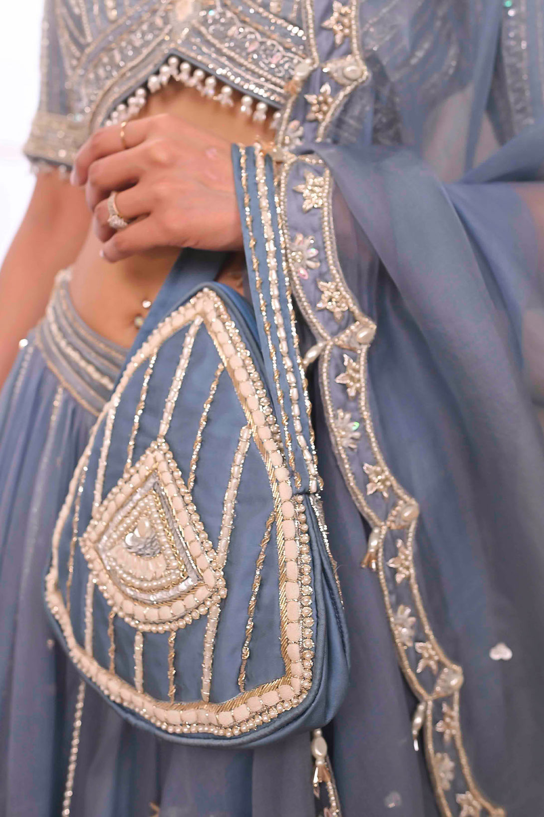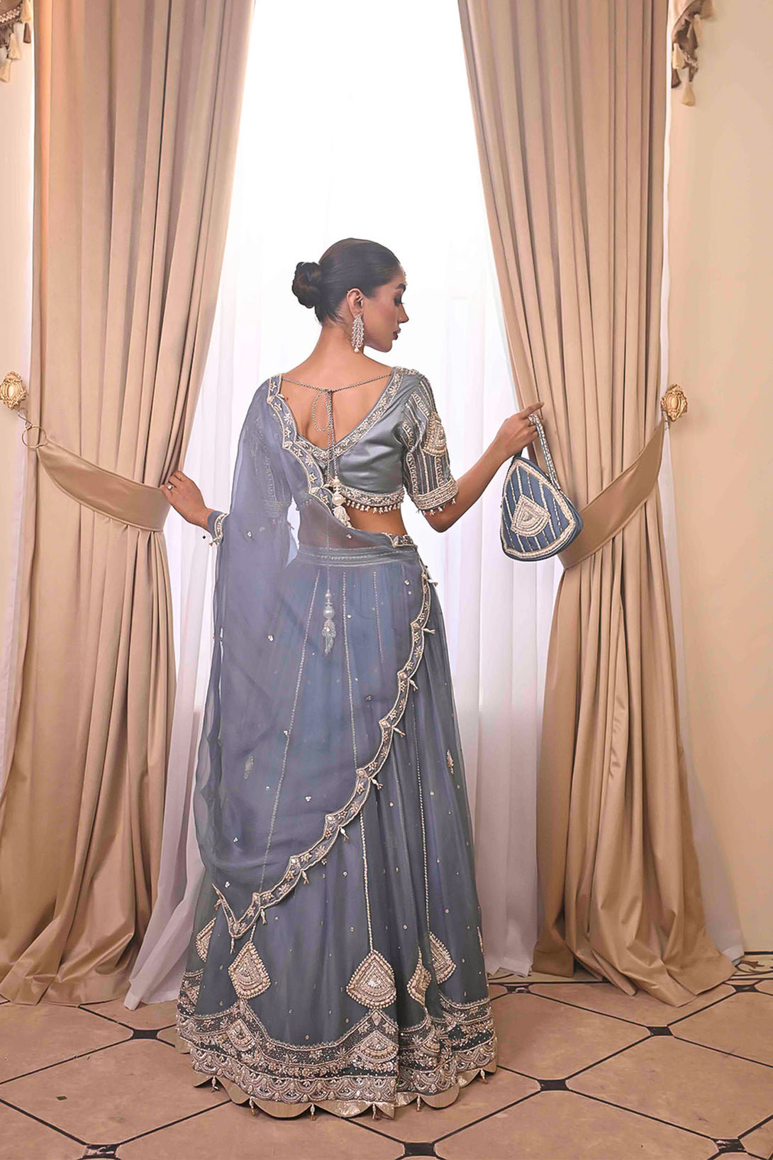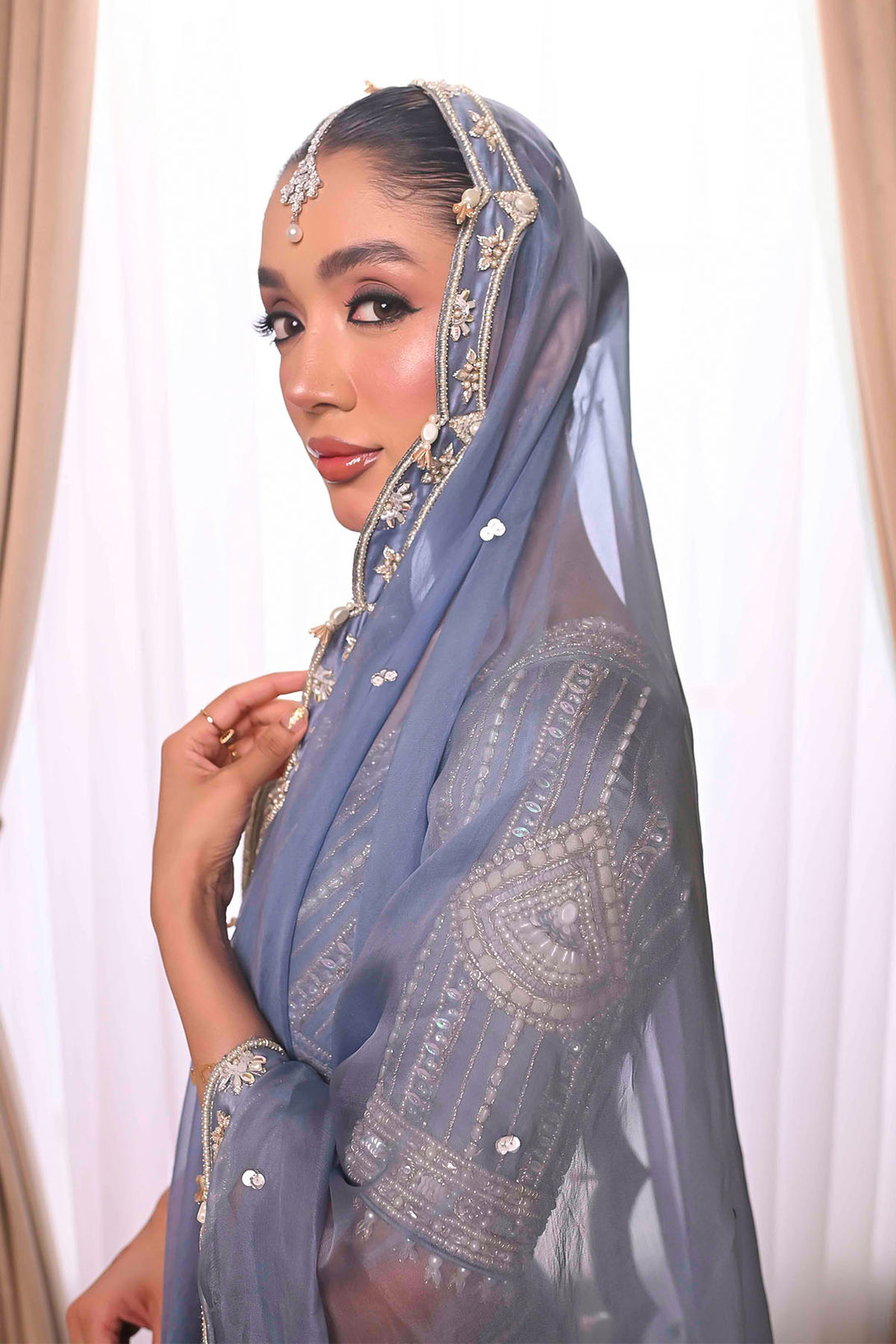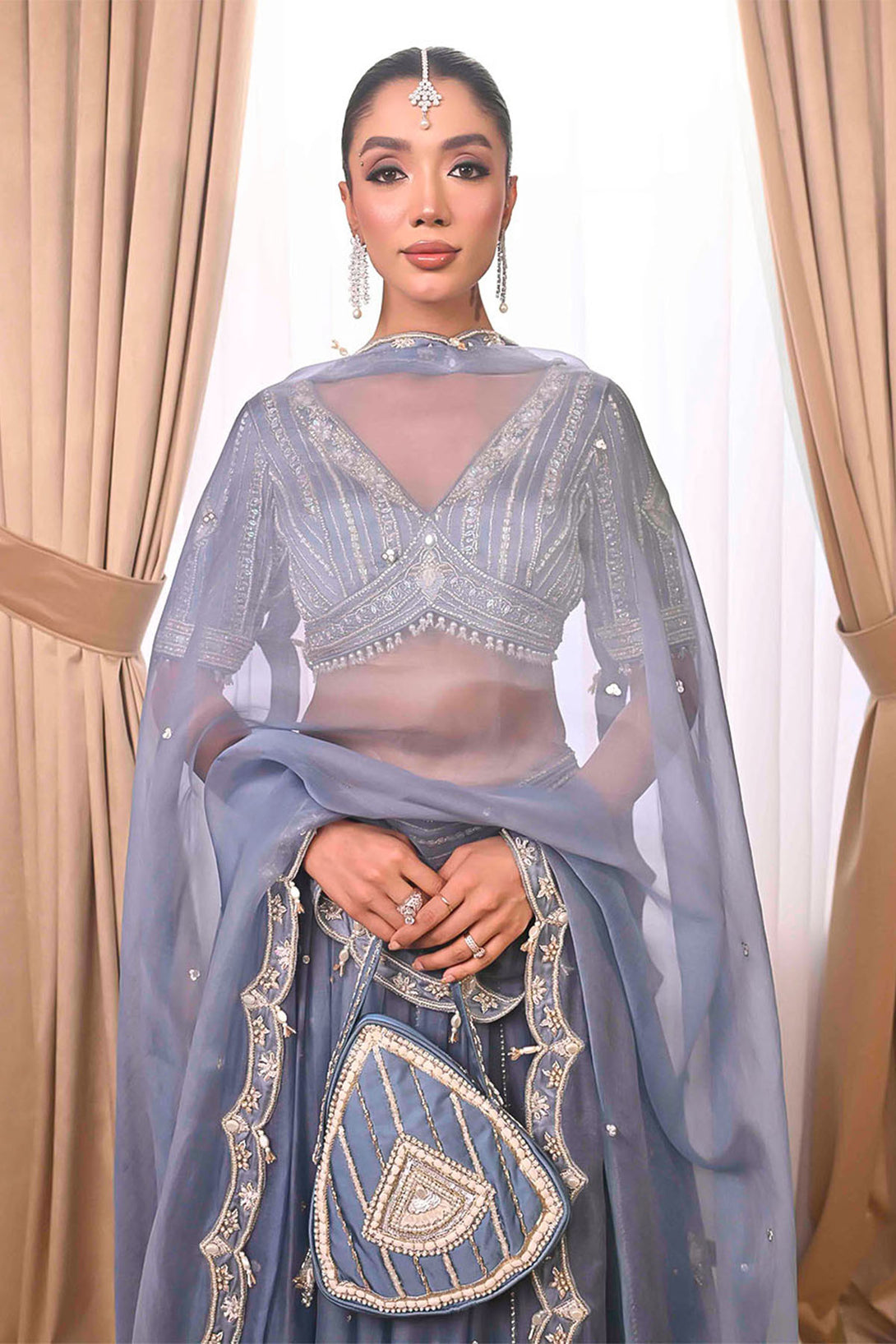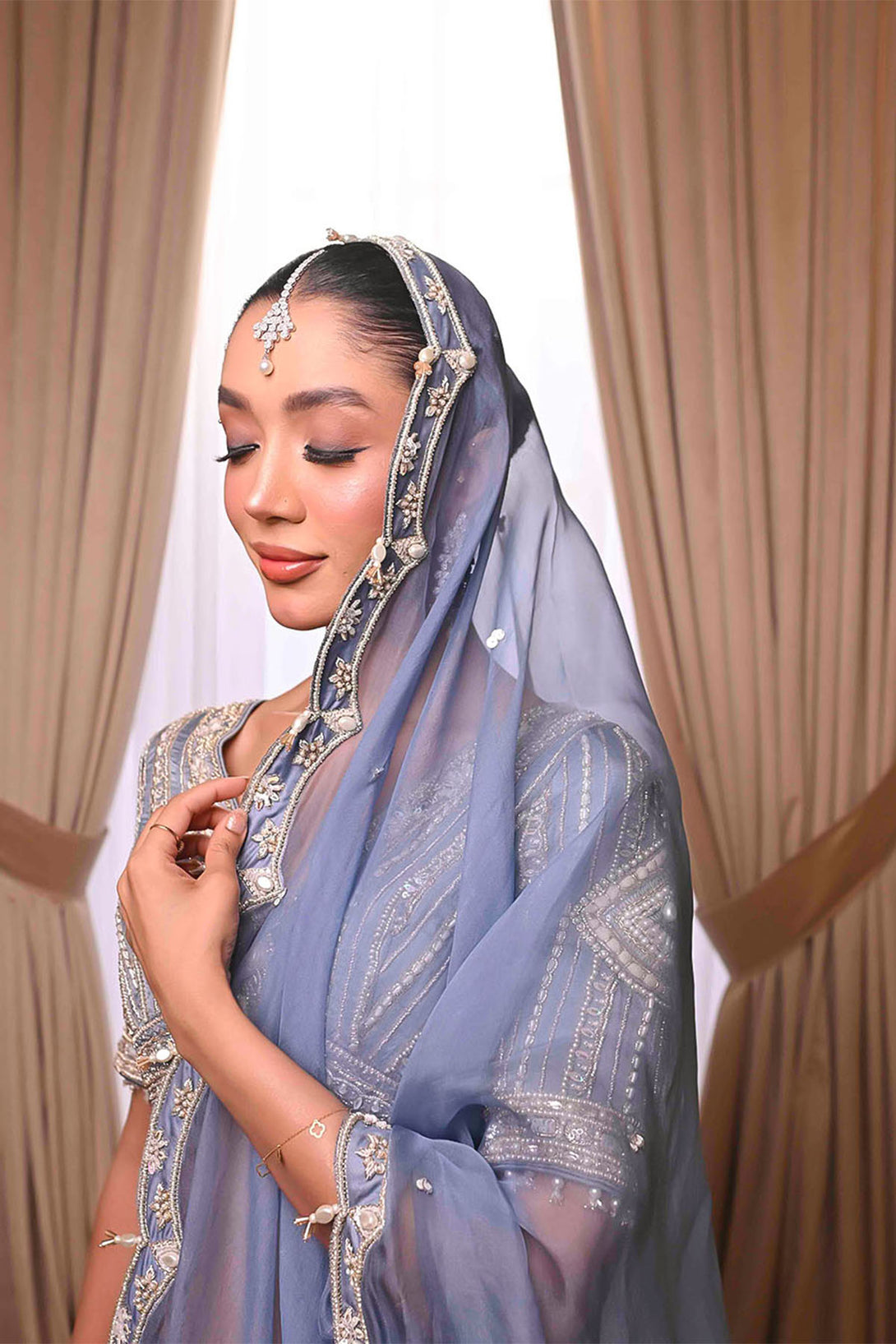 Styled with a matching scallop-cut organza dupatta featuring hand embroidery