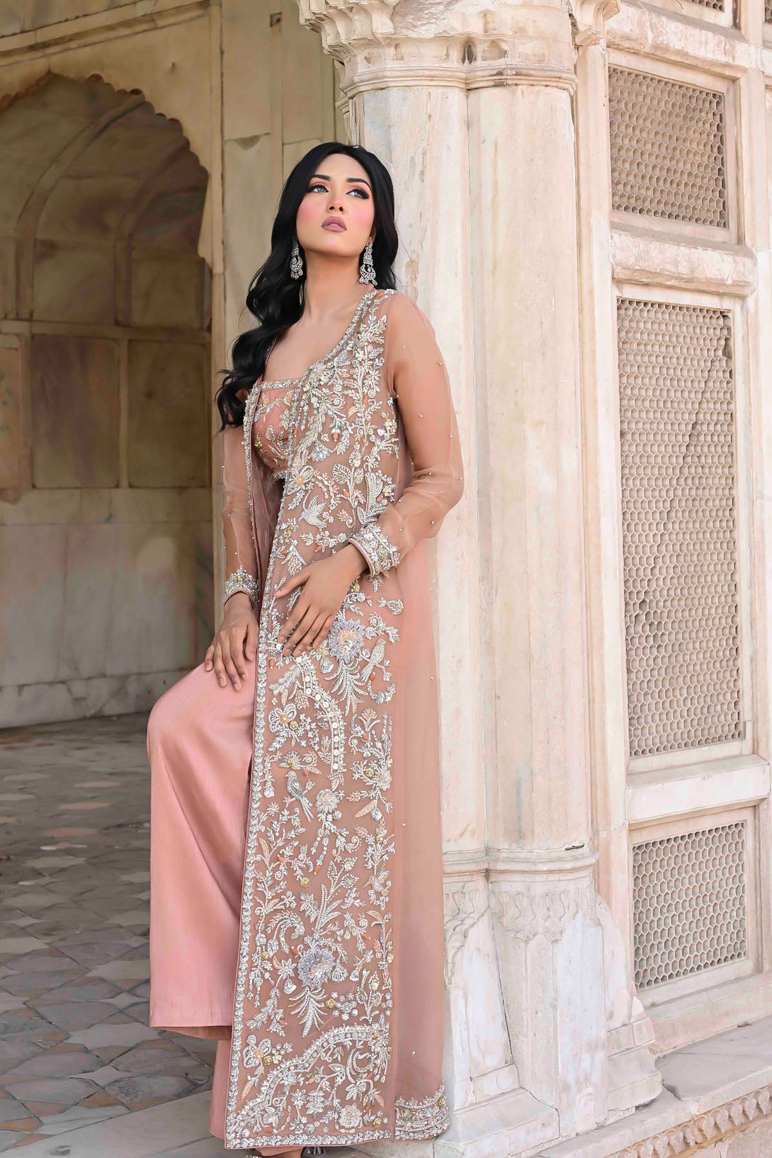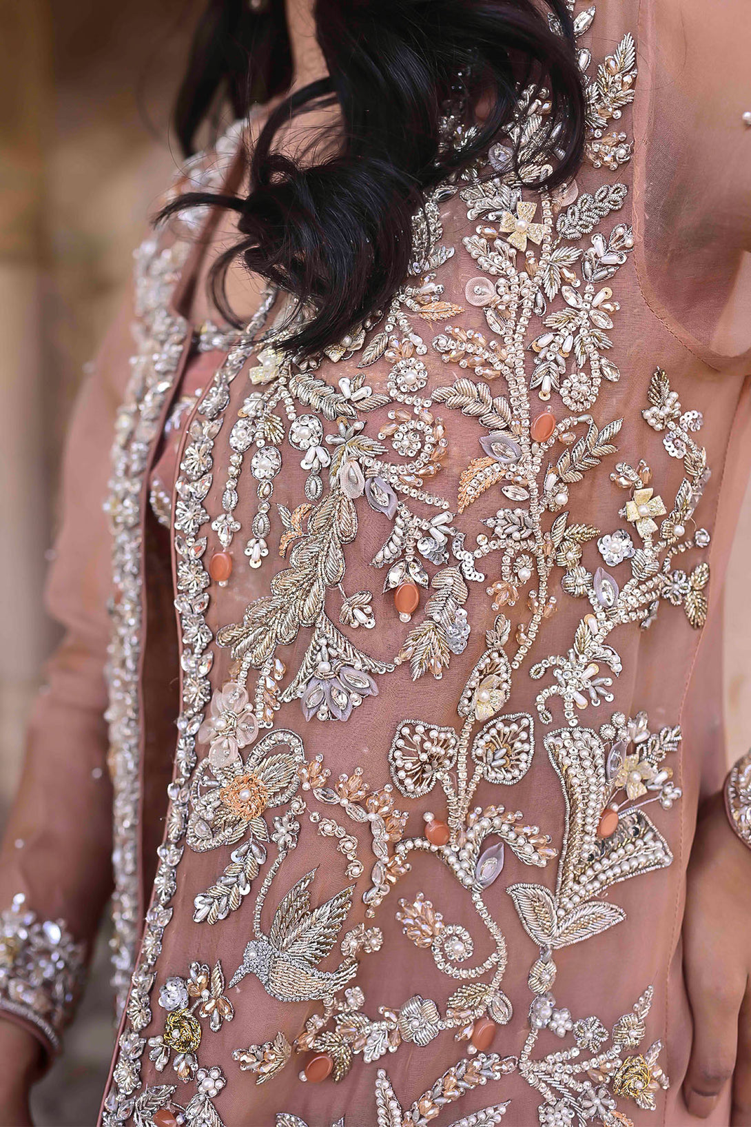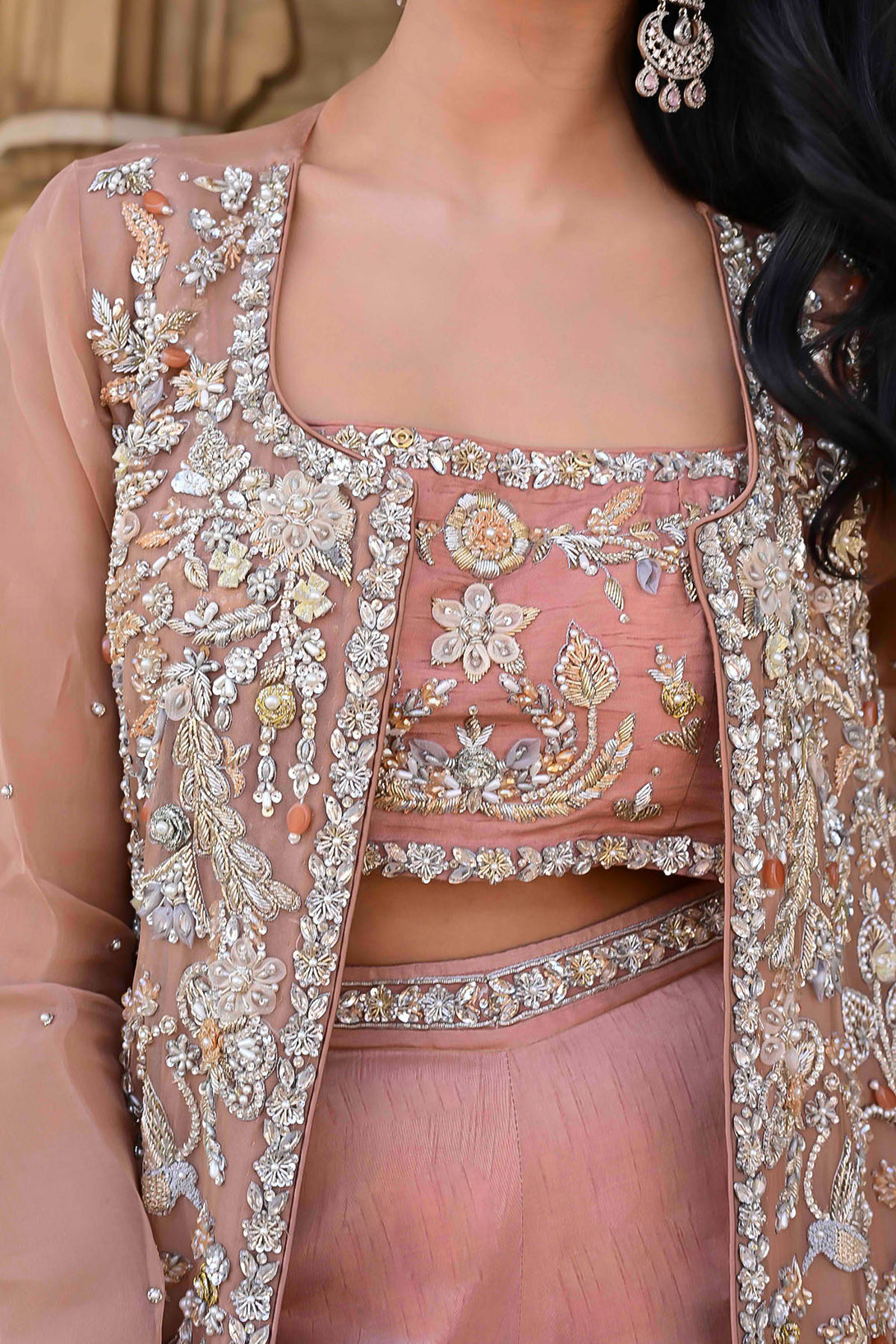 A long organza jacket featuring handcrafted detailing of crystals, dabka, kora, pearls, organza & net flowers, stones, and nakshi