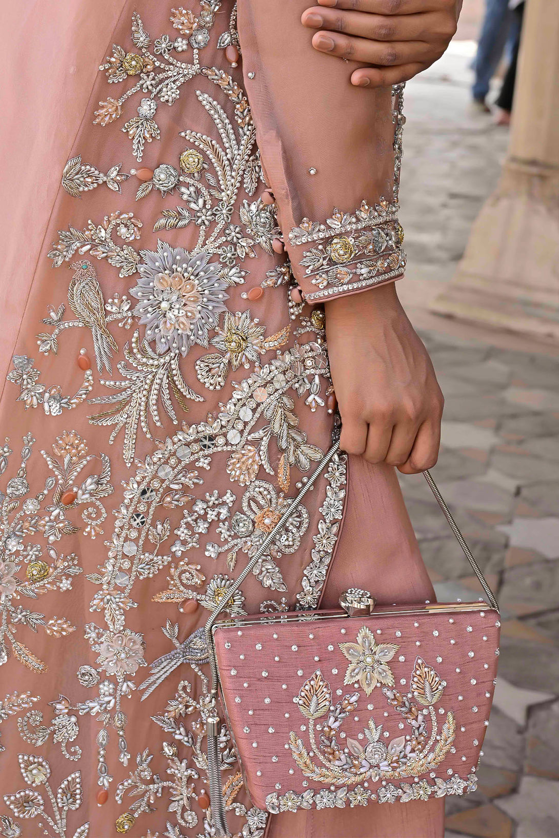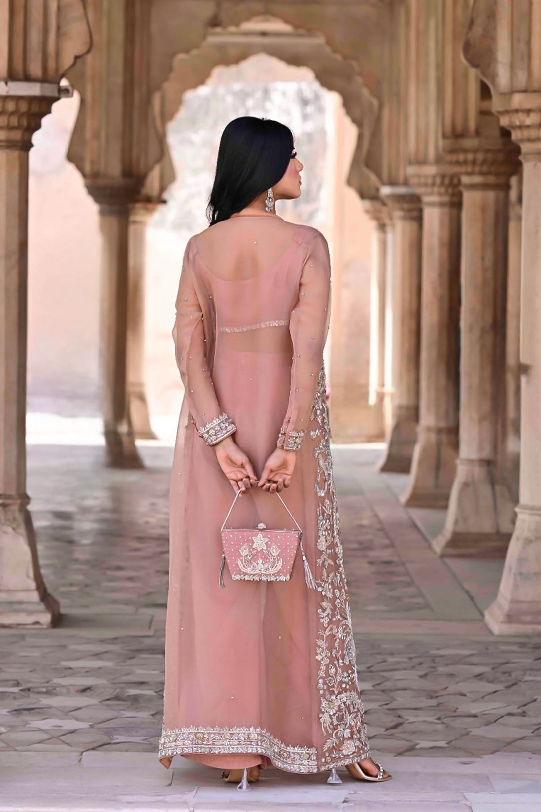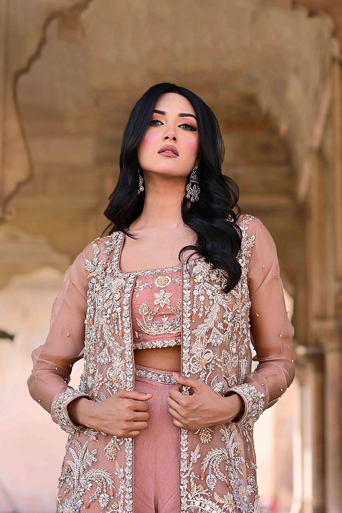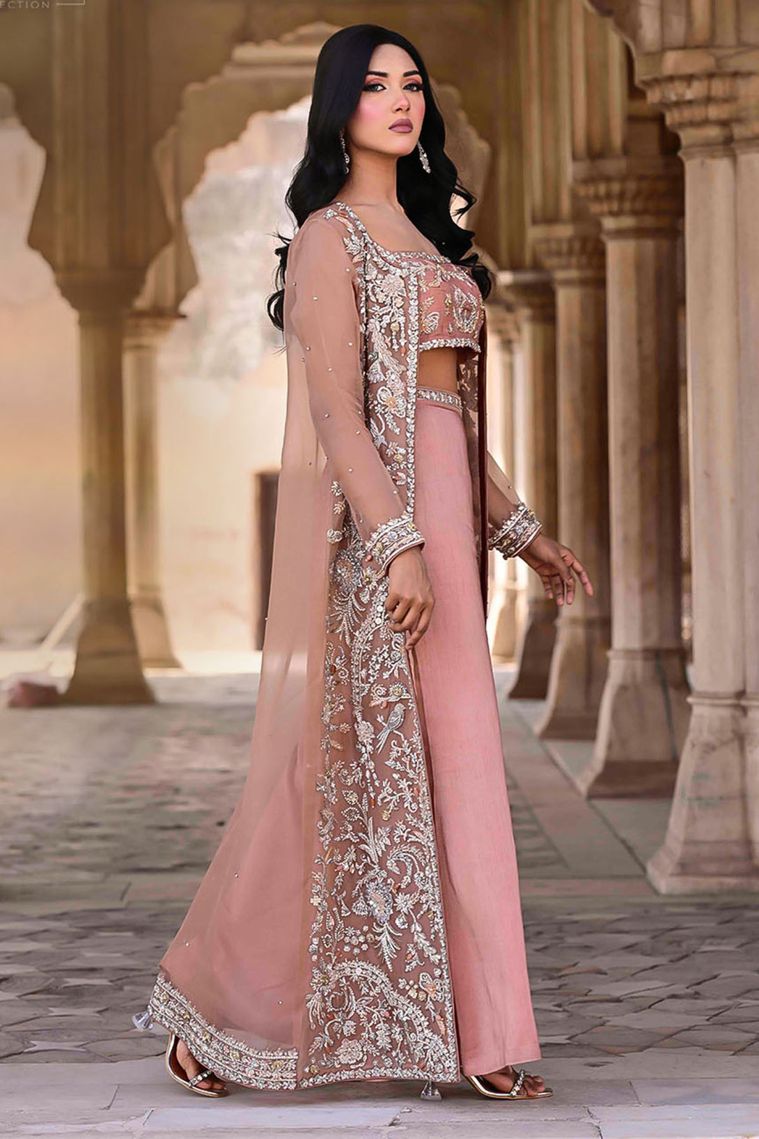 A long organza jacket featuring handcrafted detailing of crystals, dabka, kora, pearls, organza & net flowers, stones, and nakshi