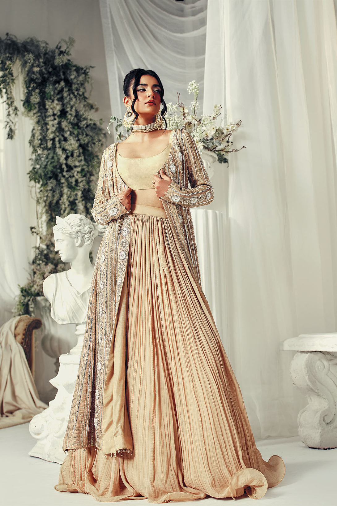 A flowing chiffon silk crinkled lehenga skirt, creating a soft shimmer and dreamy movement with every step