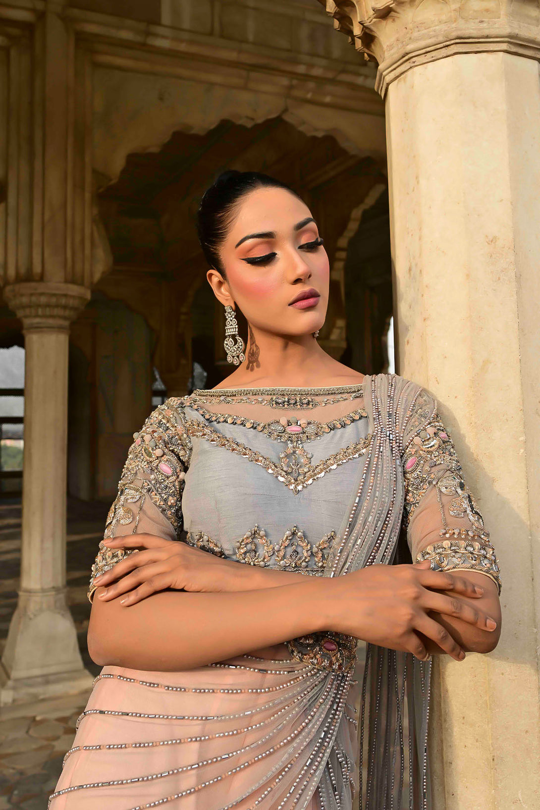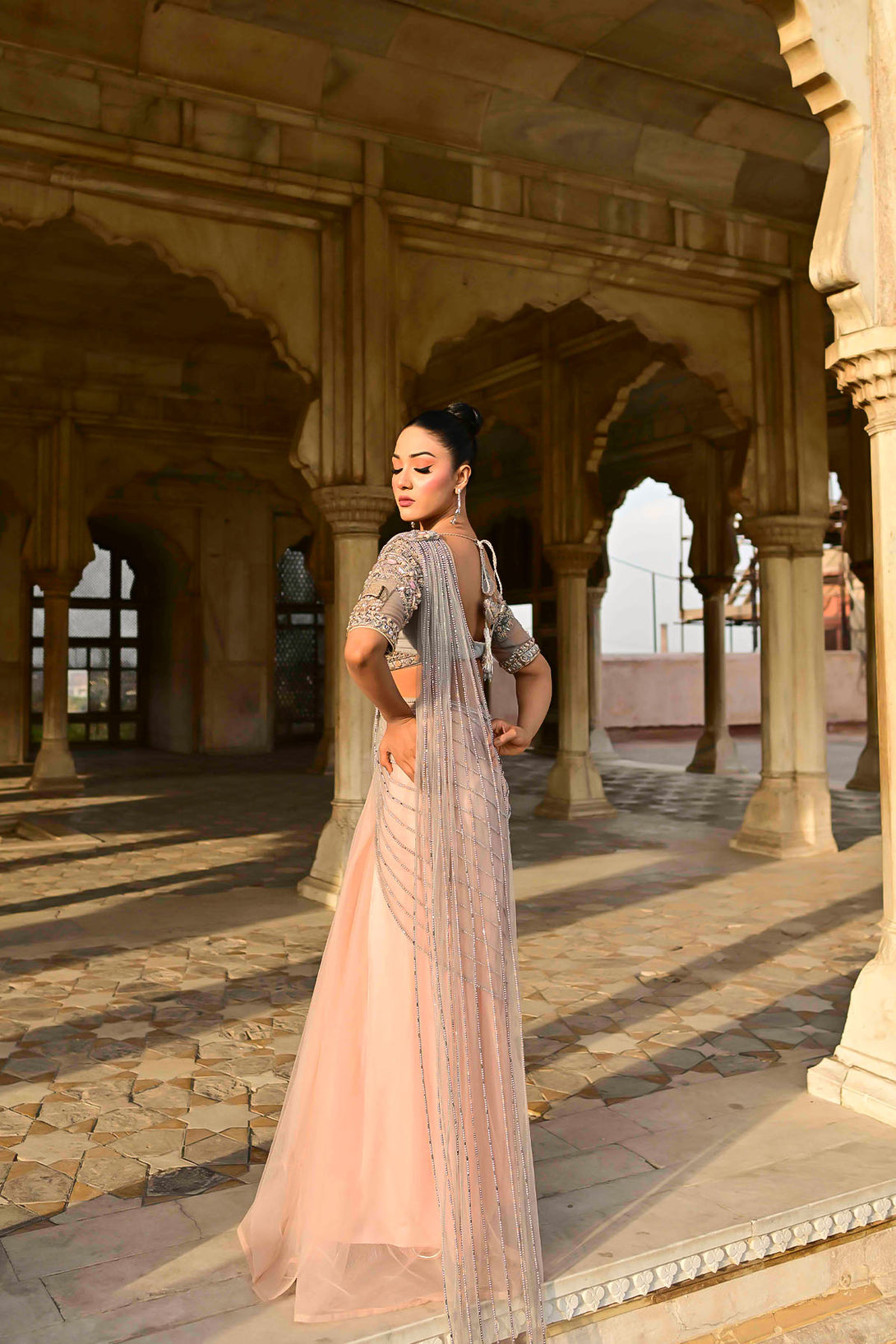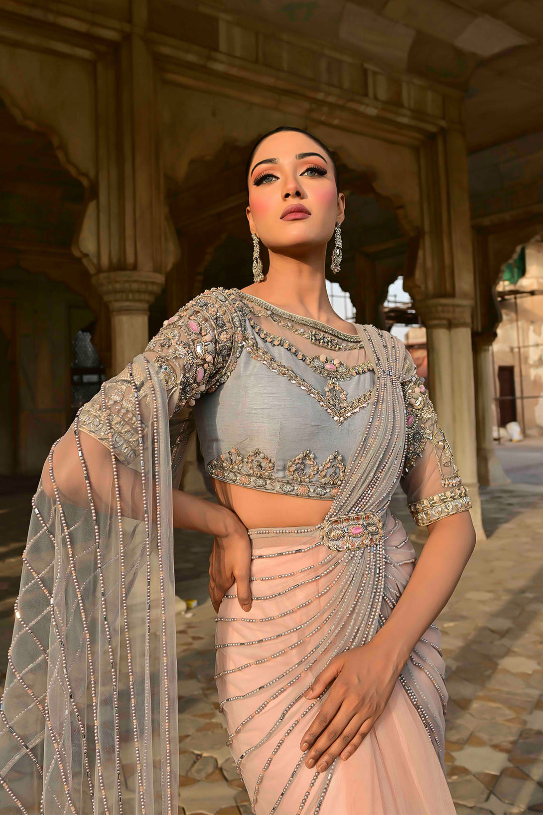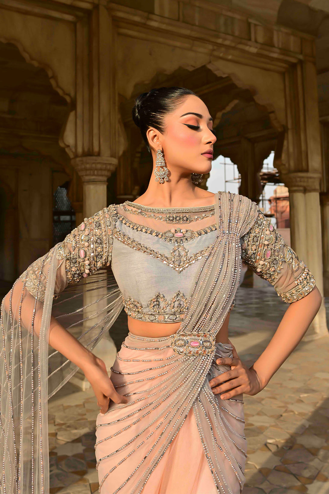 Paired with a baby pink pre-pleated draped sari, effortlessly stylish and easy to wear