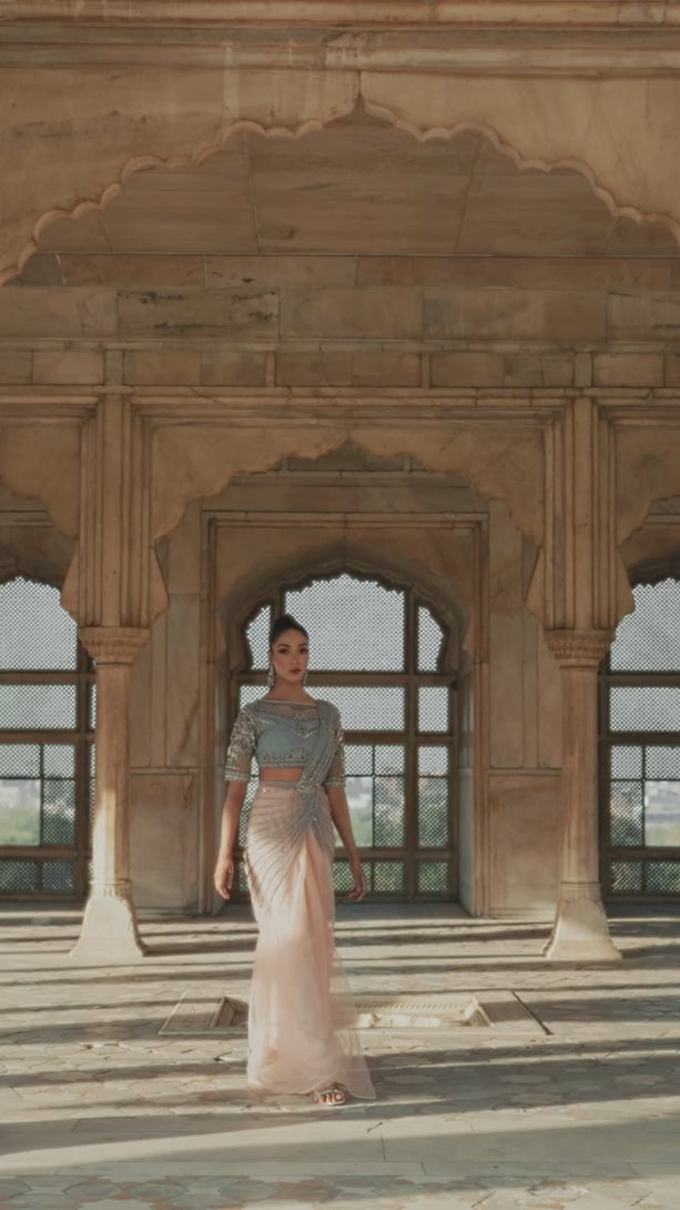 Turn heads with Rani, our regal draped fusion sari designed to celebrate bold femininity and intricate craftsmanship. This ready-to-wear masterpiece includes: