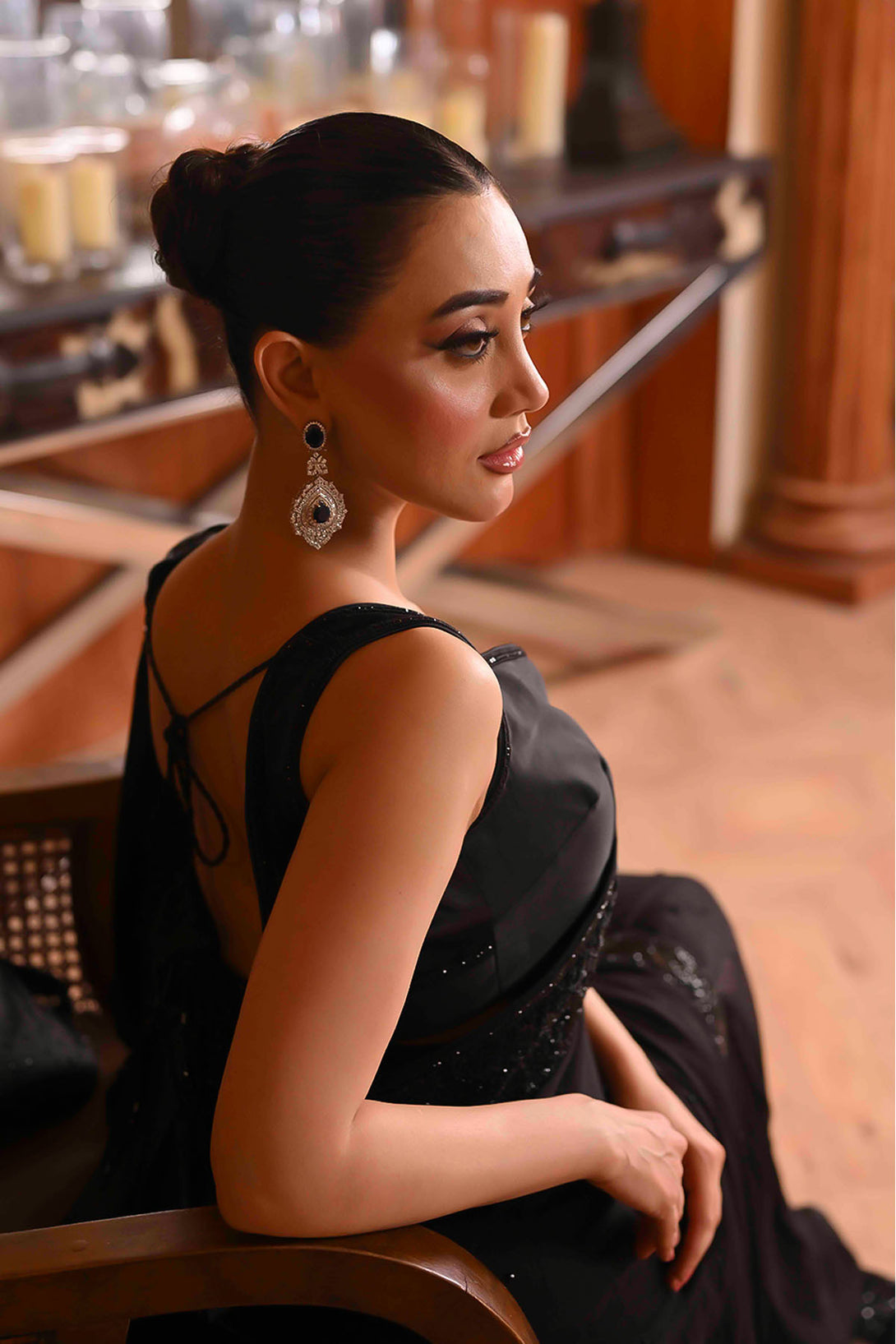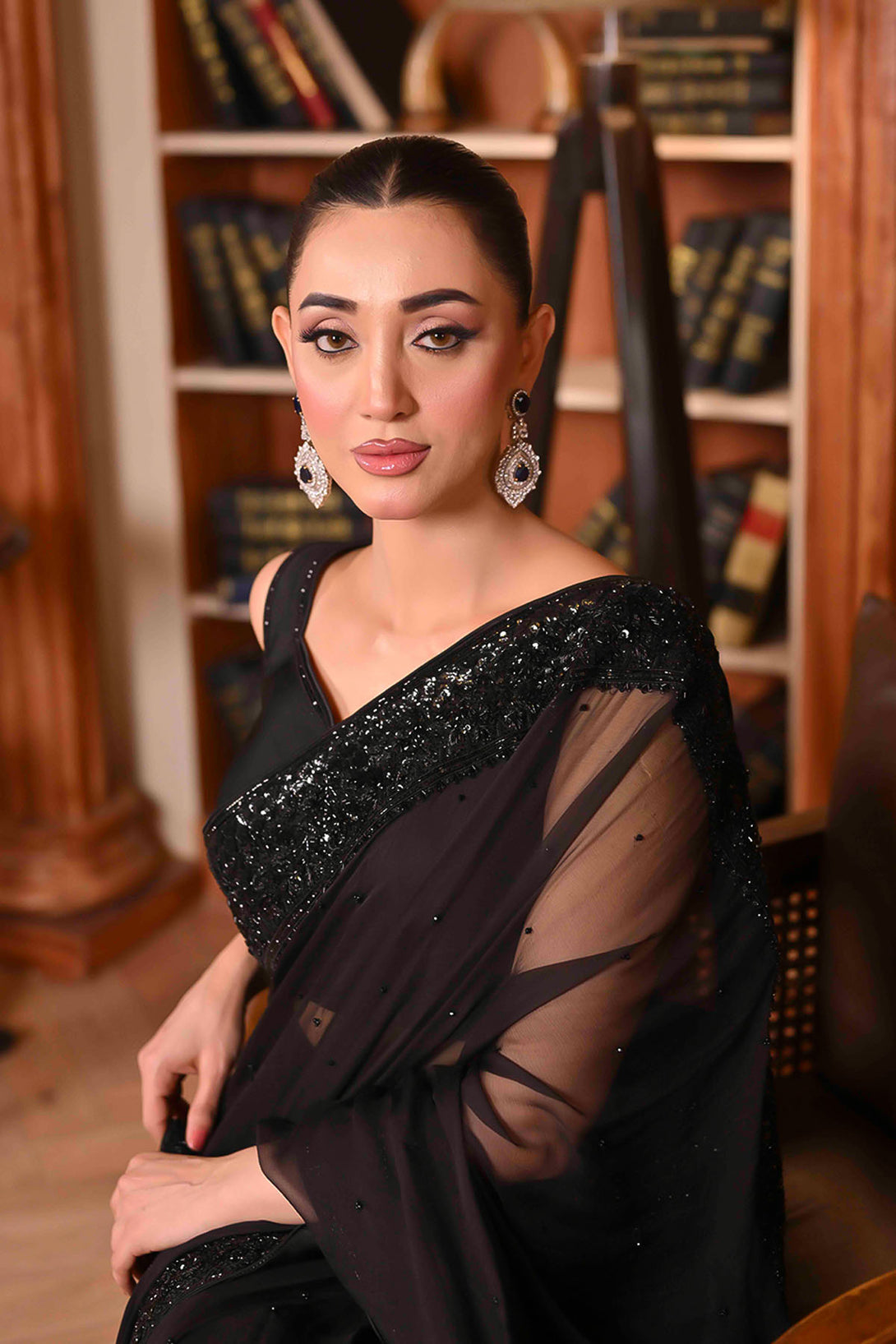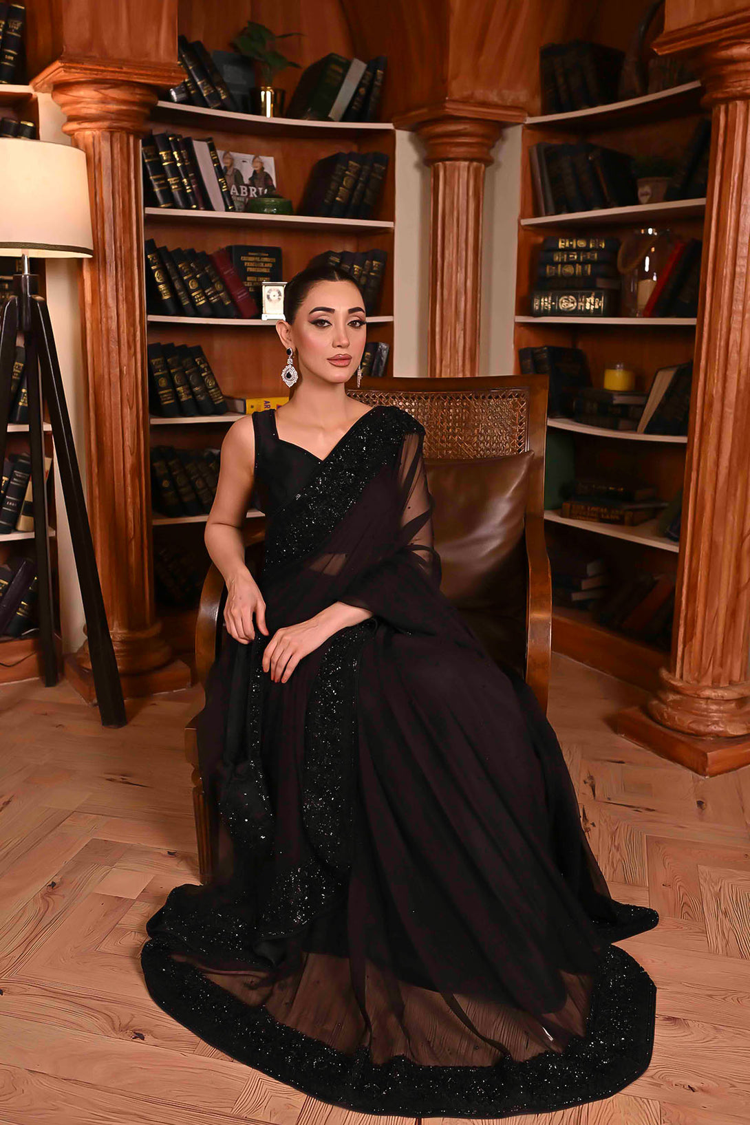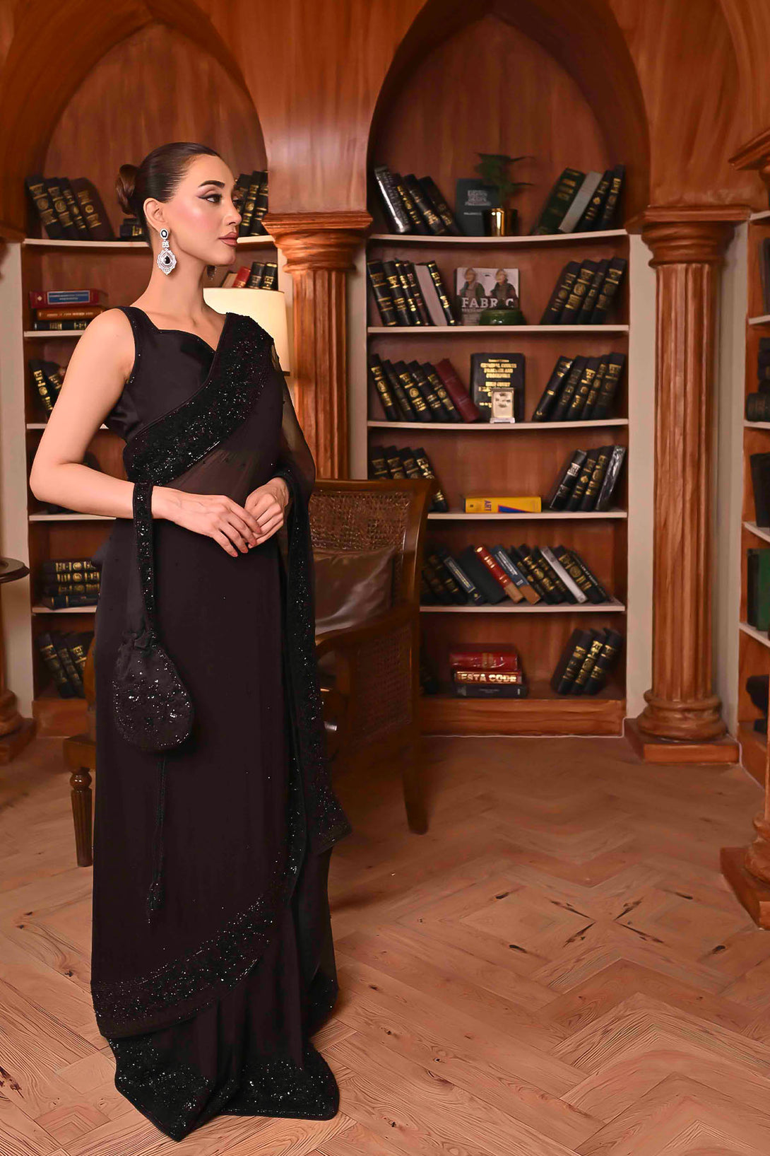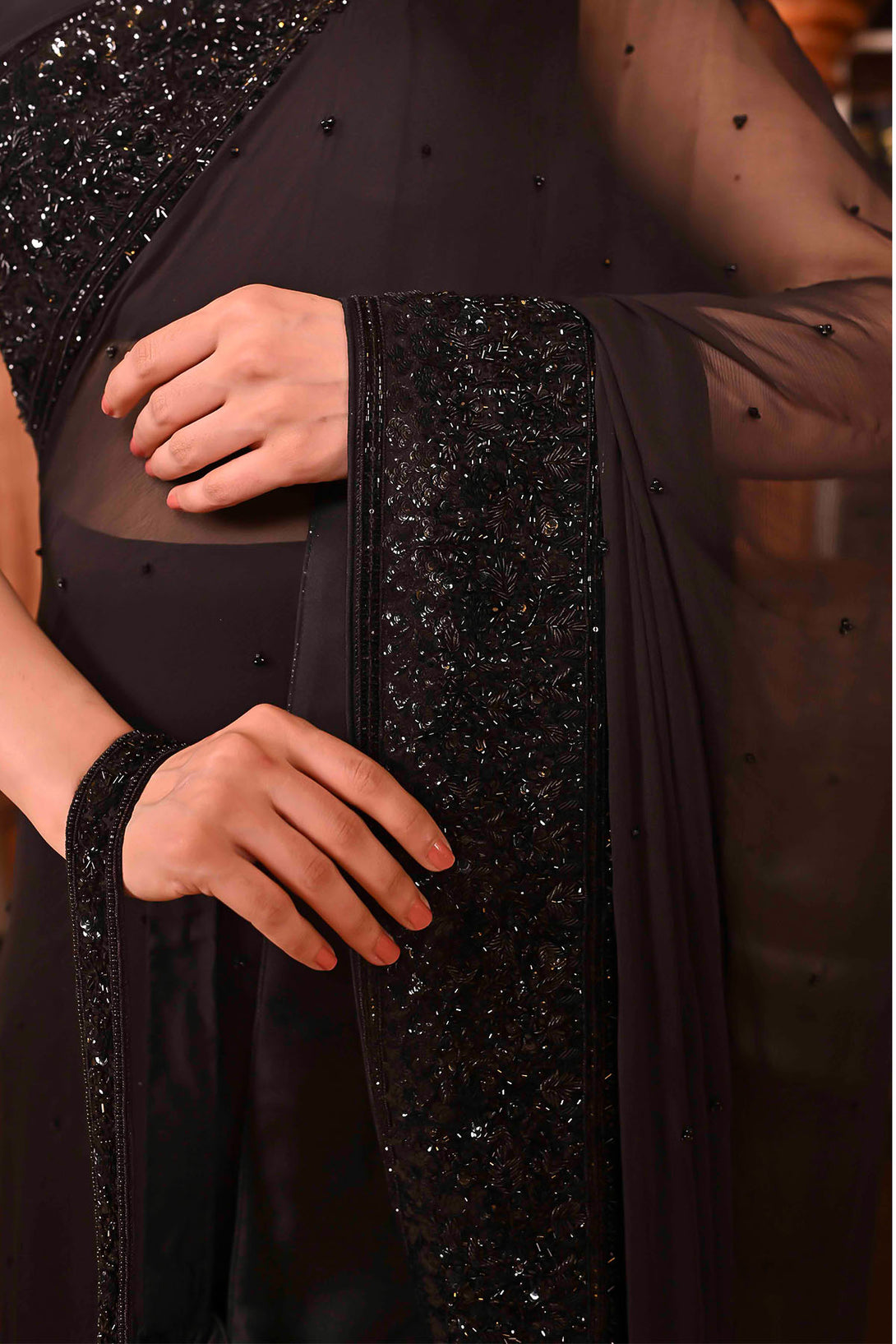 Elegant black-on-black handwork with intricate kora, dabka, sitara, pearls, and kutdana embellishments