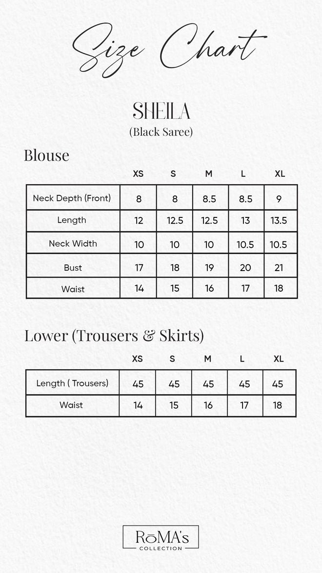 Sheila – a handcrafted chiffon sari that embodies timeless elegance and sophistication. This luxurious black-on-black ensemble features intricate kora, dabka, sitara, pearls, and kutdana embellishments on flowing chiffon that drapes beautifully. Finished with a delicate border for a refined, high-fashion look and paired with a matching pouch for a complete ensemble.