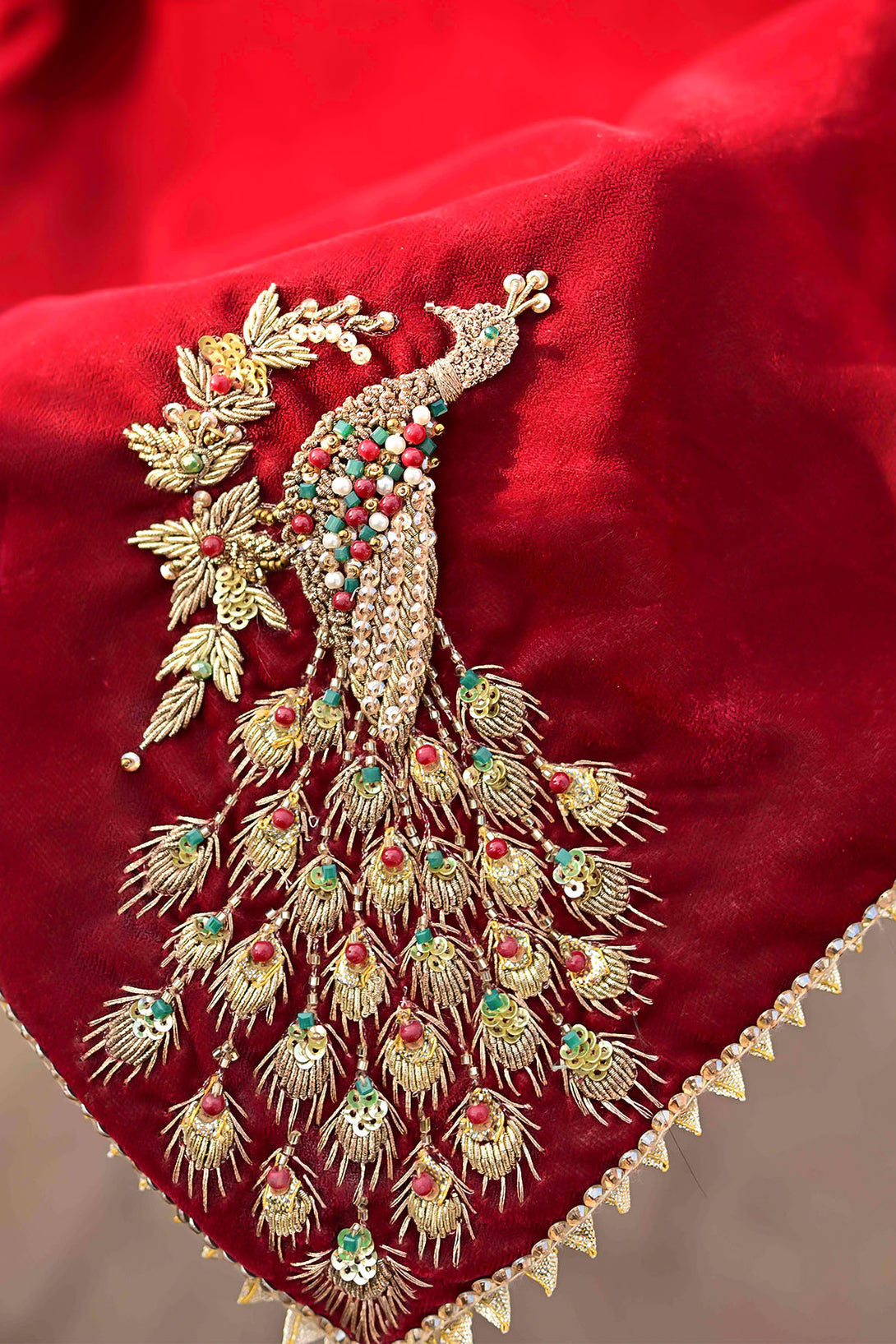 Styled with a delicate organza dupatta and a rich maroon velvet shawl with Banarasi luxury inner lining